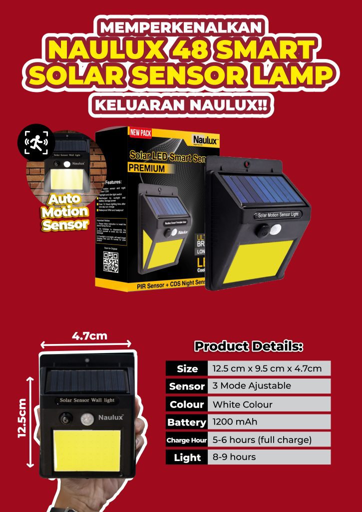 Lampu Naulux ni akan cas sendiri guna matahari waktu siang dan Automatik ON pada waktu malam/gelap